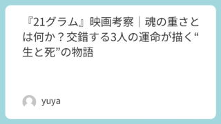 『21グラム』映画考察|魂の重さとは何か?交錯する3人の運命が描く“生と死”の物語 映画『21グラム』は、アレハンドロ・ゴンザレス・イニャリトゥ監督による、人生の「喪失」と「再生」、そして“魂の重さ”をめぐる重層的なドラマです。交通事故を機に交錯する3人の人生を、時間軸をバラバラに配置した独特の構成で描き、人が抱える罪・贖... 2025.11.21 Uncategorized