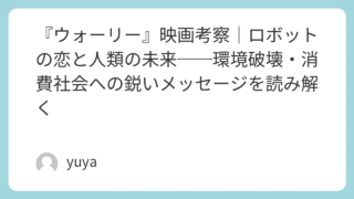 『ウォーリー』映画考察|ロボットの恋と人類の未来──環境破壊・消費社会への鋭いメッセージを読み解く ピクサー作品の中でも、とりわけ“静かな傑作”として語られることの多い『WALL·E/ウォーリー』。ほとんどセリフがない前半、ロボット同士の恋愛という意外性、そして人類文明への辛辣なメッセージ──。初見ではただの可愛らしいSFアニメとして楽し... 2025.11.21 Uncategorized