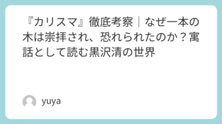 『カリスマ』徹底考察|なぜ一本の木は崇拝され、恐れられたのか?寓話として読む黒沢清の世界 黒沢清監督による映画「カリスマ」(1999年)は、日本映画の中でも特に“難解な作品”として語られることが多い一本です。一本の木を巡って人々が対立し、森の中で展開される奇妙な緊張感。「結局この映画は何を描いているの?」「なぜこんなに象徴表現が... 2025.11.24 Uncategorized