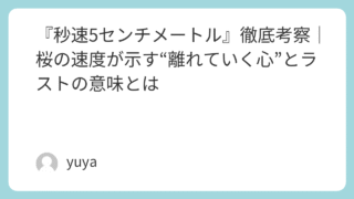 『秒速5センチメートル』徹底考察|桜の速度が示す“離れていく心”とラストの意味とは 新海誠監督の代表作として、今なお語り継がれる『秒速5センチメートル』。「離れていく心」「届かない想い」「すれ違う人生」を丁寧に描いた本作は、鑑賞者の人生経験によって見え方が大きく変わる作品でもあります。本記事では、「秒速 5cm 映画 考察... 2025.11.26 Uncategorized