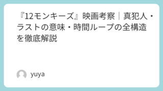 『12モンキーズ』映画考察|真犯人・ラストの意味・時間ループの全構造を徹底解説 1995年公開の映画『12モンキーズ』は、時間移動、ウイルス、孤独、記憶の循環といった多層的なテーマを内包した、テリー・ギリアム監督の代表作の一つです。ブルース・ウィリス、マデリン・ストウ、ブラッド・ピットら豪華キャストが出演しながらも、単... 2025.11.19 Uncategorized