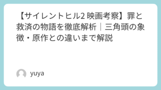【サイレントヒル2 映画考察】罪と救済の物語を徹底解析|三角頭の象徴・原作との違いまで解説 映画『サイレントヒル』シリーズは、ゲーム原作ならではの深い心理描写と、霧に覆われた独特の世界観で多くのファンを惹きつけてきました。その中でも、原作ゲーム『Silent Hill 2』は “罪と贖罪” をテーマとした傑作として世界的評価を受け... 2025.11.19 Uncategorized