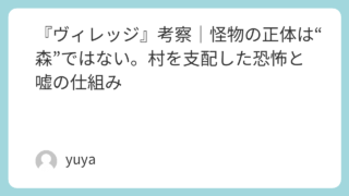 『ヴィレッジ』考察|怪物の正体は“森”ではない。村を支配した恐怖と嘘の仕組み ホラー映画だと思って観たのに、観終わったあとに残るのは「怪物」の恐怖ではなく、人間と社会の“仕組み”へのざわつき――。映画『ヴィレッジ』は、森に囲まれた閉鎖的な村と、そこに伝わる“語ってはならぬモノ”をめぐる物語です。しかし物語が進むほど、... 2025.11.19 2026.03.05 Uncategorized