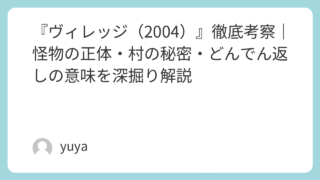 『ヴィレッジ(2004)』徹底考察|怪物の正体・村の秘密・どんでん返しの意味を深掘り解説 M・ナイト・シャマラン監督の映画『ヴィレッジ(The Village)』(2004)は、ホラーの皮を被りながらも、恐怖の本質・共同体の心理・愛の力をテーマにした極めて寓意的な作品です。表面上は“森に棲む怪物”に怯える村の人々の物語ですが、実... 2025.11.19 Uncategorized