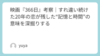 映画『366日』考察|すれ違い続けた20年の恋が残した“記憶と時間”の意味を深掘りする 映画『366日』は、HYの名曲「366日」をモチーフに、20年近くに及ぶ“想いの積み重ね”を描いた純愛ドラマです。沖縄と東京を舞台に、再会・葛藤・すれ違いを丁寧に追いかけながら、“叶わない恋”と“続いていく人生”のリアルを映し出します。検索... 2025.11.19 Uncategorized