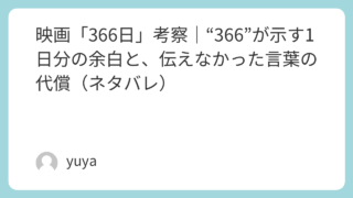 映画「366日」考察|“366”が示す1日分の余白と、伝えなかった言葉の代償(ネタバレ) もし、あのとき一言だけ言えていたら――。映画「366日」は、ただの“泣ける恋愛映画”ではなく、伝えなかった言葉が時間の中でどう膨らみ、人生そのものを変えてしまうのかを描いた物語です。沖縄で始まった青春の恋は、上京、夢、生活の速度、そして沈黙... 2025.11.19 2026.03.05 Uncategorized