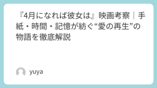 『4月になれば彼女は』映画考察|手紙・時間・記憶が紡ぐ“愛の再生”の物語を徹底解説 映画『4月になれば彼女は』は、川村元気による同名小説を原作に、“いま目の前にいる人を大切にできているのか”という普遍的な問いを投げかける作品です。主人公・藤代俊、婚約者の弥生、そして10年前に突然姿を消した初恋の人・ハル。三人のあいだに流れ... 2025.11.19 Uncategorized