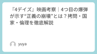 『4デイズ』映画考察|4つ目の爆弾が示す“正義の崩壊”とは?拷問・国家・倫理を徹底解説 テロ計画を阻止するために、国家がどこまで非常手段を行使してよいのか――。映画『4デイズ(原題:Unthinkable)』は、ただのサスペンス映画ではありません。拷問、国家安全保障、人権、信仰、そして“正義”の境界線を真正面から描き、観客に重... 2025.11.19 Uncategorized