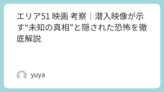 エリア51 映画 考察|潜入映像が示す“未知の真相”と隠された恐怖を徹底解説 映画『エリア51(Area 51)』は、謎に包まれたアメリカ軍の極秘基地“エリア51”へと潜入する若者たちを追ったPOV形式(主観映像)ホラー/SF作品です。UFO、宇宙人、実験、監視社会——古くから陰謀論の温床となってきたこの場所を舞台に... 2025.11.19 Uncategorized