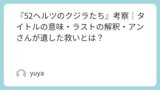 『52ヘルツのクジラたち』考察|タイトルの意味・ラストの解釈・アンさんが遺した救いとは? 映画『52ヘルツのクジラたち』は、ただ悲しいだけのヒューマンドラマではありません。この作品が描いているのは、誰にも届かない声を抱えた人たちの孤独と、それでもなお誰かとつながろうとする切実な願いです。タイトルに込められた「52ヘルツ」の意味、... 2025.11.19 2026.03.06 Uncategorized
