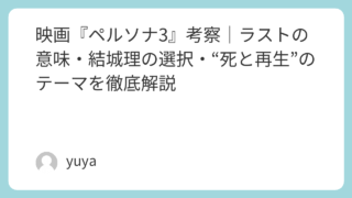 映画『ペルソナ3』考察|ラストの意味・結城理の選択・“死と再生”のテーマを徹底解説 劇場版『ペルソナ3』は、単なるゲーム原作のアニメ映画ではありません。4部作を通して描かれるのは、結城理たちが“死”という避けられない現実と向き合いながら、それでも生きる意味を見つけていく物語です。公式でも本作は、死を見つめ、その先にある春へ... 2025.11.20 2026.03.06 Uncategorized