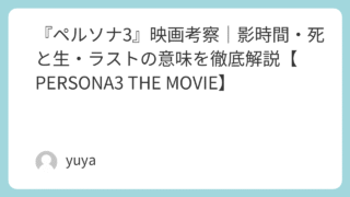 『ペルソナ3』映画考察|影時間・死と生・ラストの意味を徹底解説【PERSONA3 THE MOVIE】 『PERSONA3 THE MOVIE』は、アトラス原作の名作RPG『ペルソナ3』を4部構成で映画化した作品です。人気シリーズの中でも“死と再生”という重厚なテーマを扱う本作は、映画版ならではの演出や再構成により、物語の核心がよりシャープに... 2025.11.20 Uncategorized