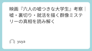 映画『六人の嘘つきな大学生』考察|嘘・裏切り・就活を描く群像ミステリーの真相を読み解く 映画『六人の嘘つきな大学生』は、就職活動という“人生の分岐点”を舞台に、6人の大学生が抱える嘘や秘密を暴いていく群像ミステリーです。密室空間で暴露される裏切り、真相が明らかになるにつれて浮かび上がる人間関係の歪み――。この記事では、「6人の... 2025.11.20 Uncategorized