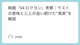 映画『64 ロクヨン』考察|ラストの意味と三上が追い続けた“真実”を解説 映画『64 ロクヨン』は、未解決事件をめぐるサスペンスでありながら、単なる犯人探しでは終わらない重厚な人間ドラマです。昭和64年に起きた少女誘拐殺人事件“ロクヨン”を軸に、警察組織の対立、報道との衝突、そして父親たちの喪失と苦悩が濃密に描か... 2025.11.20 2026.03.08 Uncategorized