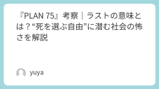 『PLAN 75』考察|ラストの意味とは?“死を選ぶ自由”に潜む社会の怖さを解説 75歳以上の高齢者が、自ら生死を選べる制度――。映画『PLAN 75』は、その衝撃的な設定によって、観る者に強い不安と問いを残す作品です。しかし本作の恐ろしさは、単なる近未来SFの不気味さにあるのではありません。高齢者の孤立、老後の貧困、自... 2025.11.20 2026.03.08 Uncategorized