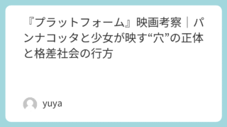 『プラットフォーム』映画考察|パンナコッタと少女が映す“穴”の正体と格差社会の行方 ※本記事は映画『プラットフォーム』(2019)の結末までネタバレを含みます。未視聴の方はご注意ください。極限状態のサバイバルと、むき出しの「格差社会」をこれ以上ないほど直接的に見せつけてくるスペイン映画『プラットフォーム』。縦方向に延びる“... 2025.11.13 Uncategorized