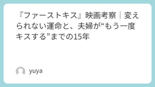 『ファーストキス』映画考察|変えられない運命と、夫婦が“もう一度キスする”までの15年 夫婦もの×タイムトラベル──と聞くと、なんとなくオチの想像がつきそうですが、『ファーストキス 1ST KISS』は一筋縄ではいかない作品でした。結婚15年目、すっかり冷え切った夫婦の“その先”に、坂元裕二の脚本と塚原あゆ子の演出が、甘さと苦... 2025.11.13 Uncategorized