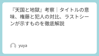 『天国と地獄』考察|タイトルの意味、権藤と犯人の対比、ラストシーンが示すものを徹底解説 黒澤明監督の名作『天国と地獄』は、誘拐事件を描いたサスペンスでありながら、単なる犯罪映画では終わらない奥深さを持った作品です。高台の豪邸に住む権藤と、その家を見上げる犯人。そこには善悪だけでは割り切れない、人間の欲望、格差社会、そして“天国... 2026.02.14 2026.03.16 Uncategorized