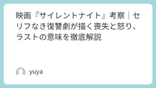 映画『サイレントナイト』考察|セリフなき復讐劇が描く喪失と怒り、ラストの意味を徹底解説 映画『サイレントナイト』は、ジョン・ウー監督が手がけた異色のリベンジアクションです。最大の特徴は、主人公が声を失っていることによって、物語の大半が“言葉なし”で進んでいく点にあります。しかし本作の魅力は、単なる実験的な演出にとどまりません。... 2026.02.14 2026.03.16 Uncategorized