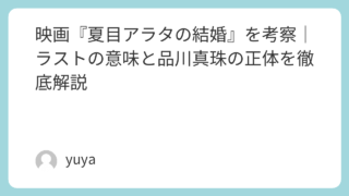 映画『夏目アラタの結婚』を考察|ラストの意味と品川真珠の正体を徹底解説 映画『夏目アラタの結婚』は、死刑囚へのプロポーズから始まる異色のサスペンスでありながら、その本質は単なる事件解明では終わらない深い人間ドラマにあります。主人公・夏目アラタと、連続殺人犯として知られる品川真珠の関係は、駆け引きのようでいて、や... 2026.02.14 2026.03.16 Uncategorized