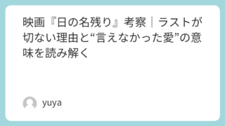 映画『日の名残り』考察|ラストが切ない理由と“言えなかった愛”の意味を読み解く 映画『日の名残り』は、派手な展開がある作品ではありません。しかし、静かに積み重なる会話や視線の奥には、取り返せなかった人生への後悔と、決して言葉にできなかった想いが深く刻まれています。本作を観終えたあと、「なぜこんなにも切ないのか」「スティ... 2026.02.14 2026.03.17 Uncategorized