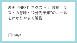 映画『NEXT -ネクスト-』考察|ラストの意味と“2分先予知”のルールをわかりやすく解説 映画『NEXT -ネクスト-』は、ニコラス・ケイジ演じる主人公が“2分先の未来”を見る能力を武器に、核テロの危機へ立ち向かっていくSFサスペンスです。設定だけを見ると王道の娯楽作に思えますが、本作の本当の面白さは、単なる超能力アクションでは... 2026.02.14 2026.03.19 Uncategorized