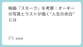 映画『スモーク』を考察|オーギーの写真とラストが描く“人生の余白”とは 映画『スモーク』は、ニューヨーク・ブルックリンの小さな煙草屋を舞台に、孤独や喪失を抱えた人々の人生が静かに交差していく名作です。派手な展開があるわけではないのに、観終わったあとに不思議な余韻が残るのはなぜなのでしょうか。この記事では、オーギ... 2026.02.06 2026.03.12 Uncategorized