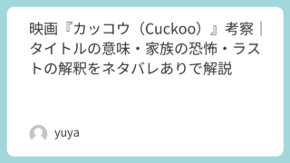 映画『カッコウ(Cuckoo)』考察|タイトルの意味・家族の恐怖・ラストの解釈をネタバレありで解説 映画『カッコウ(Cuckoo)』は、美しいアルプスのリゾート地を舞台にしながら、観る者に強烈な違和感と不安を植え付ける異色のホラー作品です。物語は一見すると“奇妙な土地で起こる怪異”を描いた作品に見えますが、その奥には「家族とは何か」「血の... 2026.02.08 2026.03.10 Uncategorized