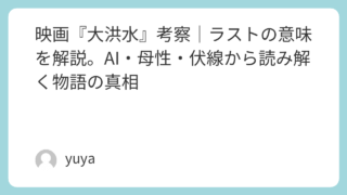 映画『大洪水』考察|ラストの意味を解説。AI・母性・伏線から読み解く物語の真相 映画『大洪水』は、一見すると“洪水による極限サバイバル”を描いたディザスター映画のように見えます。しかし物語を追うほどに、本作は単なるパニック映画ではなく、AI・母性・人間らしさをテーマにした重層的なSF作品であることが見えてきます。「ラス... 2026.02.10 2026.03.12 Uncategorized