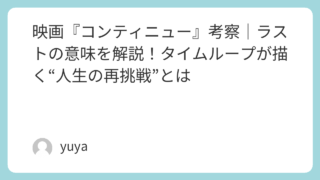 映画『コンティニュー』考察|ラストの意味を解説!タイムループが描く“人生の再挑戦”とは 映画『コンティニュー』は、何度も同じ1日を繰り返しながら、主人公ロイが死と再挑戦を重ねていくSFアクションです。一見すると、スピード感あふれる“タイムループ×無双アクション”の作品に見えますが、物語を深く追っていくと、そこには家族との関係、... 2026.02.10 2026.03.12 Uncategorized