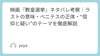 映画『教皇選挙』ネタバレ考察|ラストの意味・ベニテスの正体・“信仰と疑い”のテーマを徹底解説 映画『教皇選挙』は、ローマ教皇を選ぶ極秘選挙「コンクラーベ」を舞台にした、重厚な心理サスペンスです。閉ざされた礼拝堂の中で繰り広げられるのは、単なる後継者争いではなく、信仰、権力、そして人間の良心が激しくぶつかり合うドラマでした。特に本作は... 2026.02.10 2026.03.10 Uncategorized