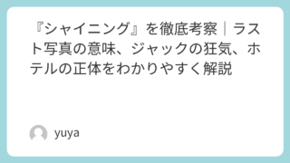 『シャイニング』を徹底考察|ラスト写真の意味、ジャックの狂気、ホテルの正体をわかりやすく解説 スタンリー・キューブリック監督による映画『シャイニング』は、ホラー映画の金字塔として今なお多くの人に語り継がれている名作です。しかし本作は、ただ怖いだけの作品ではありません。ジャックが狂っていく理由、オーバールック・ホテルに潜む異様な気配、... 2026.02.10 2026.03.12 Uncategorized