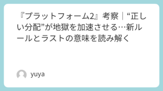 『プラットフォーム2』考察|“正しい分配”が地獄を加速させる…新ルールとラストの意味を読み解く 「みんなが自分の分だけ食べれば、全員が救われる」——それは理想的で、正しくて、いかにも“解決策”に見える。けれど『プラットフォーム2』が突きつけてくるのは、その理想が成立する瞬間にこそ、別の地獄が始まるという皮肉だ。前作が“奪い合い”の恐怖... 2026.02.10 2026.03.05 Uncategorized