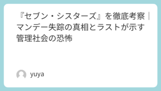 『セブン・シスターズ』を徹底考察|マンデー失踪の真相とラストが示す管理社会の恐怖 映画『セブン・シスターズ』は、近未来の一人っ子政策という衝撃的な設定と、7つ子の姉妹が1人の女性として生きる緊張感あふれる物語で、多くの観客に強い印象を残したSFスリラーです。しかし本作の魅力は、単なるサスペンスやアクションだけではありませ... 2026.02.12 2026.03.12 Uncategorized