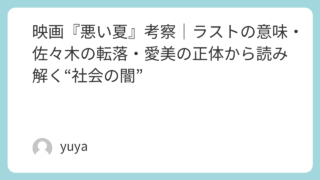 映画『悪い夏』考察|ラストの意味・佐々木の転落・愛美の正体から読み解く“社会の闇” 映画『悪い夏』は、生活保護、不正受給、貧困ビジネス、そして人間の欲望が複雑に絡み合う、後味の悪い傑作サスペンスです。一見すると「クズとワルしか出てこない」物語ですが、見終わったあとに強く残るのは、単なる胸糞の悪さだけではありません。なぜ佐々... 2026.02.02 2026.03.16 Uncategorized