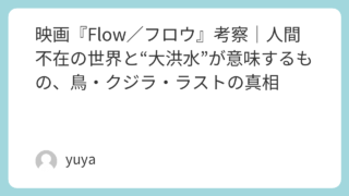 映画『Flow/フロウ』考察|人間不在の世界と“大洪水”が意味するもの、鳥・クジラ・ラストの真相 セリフがほとんどないのに、胸の奥だけはザワッと揺れる——。映画『Flow/フロウ』は、大洪水に呑まれる世界で、一匹の猫がボートに乗り“流されながら”旅をする3DCGアニメです。映像と音だけで感情を伝える作りのため、観終わったあとに「結局あれ... 2025.11.13 2026.02.20 Uncategorized