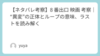 【ネタバレ考察】8 番出口 映画 考察|“異変”の正体とループの意味、ラストを読み解く 無機質な地下通路で、ただひたすら「異変」を探す——。ルールは単純なのに、なぜここまで心が削られるのか。映画版では“異変があれば引き返す/異変がなければ進む”という原作の骨格を守りながら、主人公に「迷い」を背負わせることで、間違い探しがいつの... 2025.11.15 2026.02.26 Uncategorized