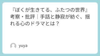 『ぼくが生きてる、ふたつの世界』考察・批評|手話と静寂が紡ぐ、揺れる心のドラマとは? 言葉が届かない世界と、届きすぎてしまう世界。『ぼくが生きてる、ふたつの世界』は、聴覚障害を持つ主人公が二つの文化的世界を行き来することで、自らの「居場所」と「アイデンティティ」を模索するヒューマンドラマです。本記事では、物語の概要から演出の... 2025.10.01 Uncategorized