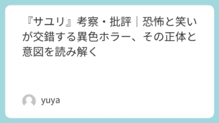 『サユリ』考察・批評|恐怖と笑いが交錯する異色ホラー、その正体と意図を読み解く 映画『サユリ』は、ホラー映画としての期待を大きく裏切りつつも、強烈な印象を残す異色作です。序盤はまさに王道の和製ホラーでありながら、後半に向けて物語は思わぬ方向へと転じます。このギャップが観客に大きな戸惑いと衝撃を与え、賛否両論を巻き起こし... 2025.10.01 Uncategorized