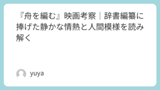 『舟を編む』映画考察|辞書編纂に捧げた静かな情熱と人間模様を読み解く 2013年に公開された映画『舟を編む』は、三浦しをんの同名小説を原作とし、石井裕也監督がメガホンを取った作品です。派手なアクションもない、恋愛劇でもない、辞書編集という一見地味な題材を取り上げながらも、じんわりと心を打つ名作として、多くの観... 2025.10.01 Uncategorized