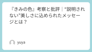 『きみの色』考察と批評|“説明されない”美しさに込められたメッセージとは? 2024年に公開されたアニメーション映画『きみの色』は、国内外で話題を呼び、賛否両論を巻き起こす作品となりました。スタジオコロリドが手掛けたこの映画は、青春を通して描かれる「心の色」や「見えないもの」をテーマにしながら、あえて説明を省いた演... 2025.10.01 Uncategorized
