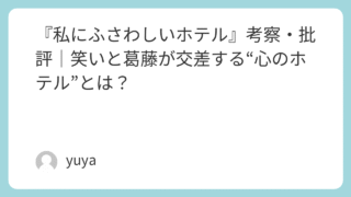『私にふさわしいホテル』考察・批評|笑いと葛藤が交差する“心のホテル”とは? 最近話題となっている邦画『私にふさわしいホテル』。一見すると軽妙なコメディに見えるこの作品は、観れば観るほど人間の本質に切り込む深いテーマを孕んでいます。この記事では、ストーリーの構造や演出、登場人物の心理描写、さらには原作との比較まで踏み... 2025.10.01 Uncategorized