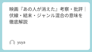 映画『あの人が消えた』考察・批評|伏線・結末・ジャンル混合の意味を徹底解説 映画『あの人が消えた』は、2025年に公開された日本映画で、ジャンルとしてはミステリーとホラー、さらにはブラックコメディ的な要素も感じさせる異色作です。「人が次々に消えていく」というシンプルながら不気味な設定の中に、伏線、視点の揺らぎ、メタ... 2025.10.01 Uncategorized