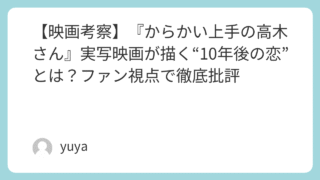 【映画考察】『からかい上手の高木さん』実写映画が描く“10年後の恋”とは?ファン視点で徹底批評 2024年に公開された実写映画『からかい上手の高木さん』は、原作漫画・アニメで長年親しまれてきた人気シリーズの“その後”を描いた意欲作です。中学生だった高木さんと西片が大人になり、小豆島で再会を果たす——という設定は、ファンにとって大きな驚... 2025.10.01 Uncategorized
