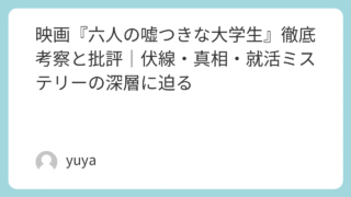 映画『六人の嘘つきな大学生』徹底考察と批評|伏線・真相・就活ミステリーの深層に迫る 近年、就職活動を題材にしたフィクション作品は増えつつありますが、『六人の嘘つきな大学生』は、その中でも群を抜いて異彩を放つ心理ミステリー作品です。本作は、就活という現代的テーマに“嘘”と“告発”という緊張感のある要素を絡めたサスペンス構成で... 2025.10.02 Uncategorized