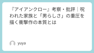 『アイアンクロー』考察・批評|呪われた家族と「男らしさ」の重圧を描く衝撃作の本質とは 2024年に日本公開された映画『アイアンクロー』は、アメリカ・プロレス界に実在した「フォン・エリック一家」の悲劇を描いた作品として、世界中の観客に衝撃を与えました。華やかなリングの裏に潜む家族の呪縛、男らしさという名の鎖、そして心を蝕むプレ... 2025.10.02 Uncategorized