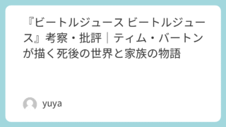 『ビートルジュース ビートルジュース』考察・批評|ティム・バートンが描く死後の世界と家族の物語 ティム・バートン監督の代表作である1988年の『ビートルジュース』。その続編となる『ビートルジュース ビートルジュース』(2024年)は、36年の時を経て再び観客を奇怪で風刺的な“死後の世界”へと誘います。本記事では、旧作とのつながりを踏ま... 2025.10.02 Uncategorized