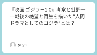 『映画 ゴジラ-1.0』考察と批評──戦後の絶望と再生を描いた“人間ドラマとしてのゴジラ”とは? 2023年に公開された『ゴジラ−1.0』は、ゴジラシリーズ生誕70周年を記念する作品でありながら、従来のシリーズとは一線を画すアプローチで大きな注目を集めました。本作は、戦後の日本を舞台に「絶望からの再生」というテーマを掲げ、単なる怪獣映画... 2025.10.02 Uncategorized